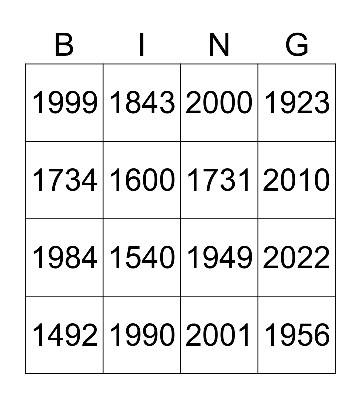 This bingo card has 16 words: 1990, 2022, 2000, 1999, 1984, 1843, 1949, 2001, 1734, 1600, 1492, 1923, 1540, 2010, 1731 and 1956.