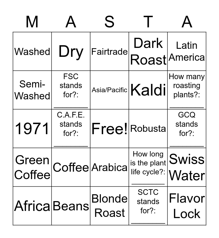 This bingo card has a free space and 24 words: Coffee, Beans, Asia/Pacific, Africa, Latin America, Washed, Semi-Washed, Dry, Robusta, Arabica, Kaldi, 1971, How long is the plant life cycle?: ________, Swiss Water, FSC stands for?: ________, SCTC stands for?: ________, GCQ stands for?: ________, Fairtrade, How many roasting plants?: ________, C.A.F.E. stands for?: ________, Flavor Lock, Green Coffee, Dark Roast and Blonde Roast.