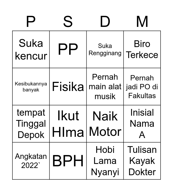 This bingo card has 16 words: BPH, Inisial Nama A, Suka Rengginang, Suka kencur, tempat Tinggal Depok, PP, Naik Motor, Hobi Lama Nyanyi, Kesibukannya banyak, Fisika, Angkatan 2022`, Biro Terkece, Ikut HIma, Pernah jadi PO di Fakultas, Pernah main alat musik and Tulisan Kayak Dokter.