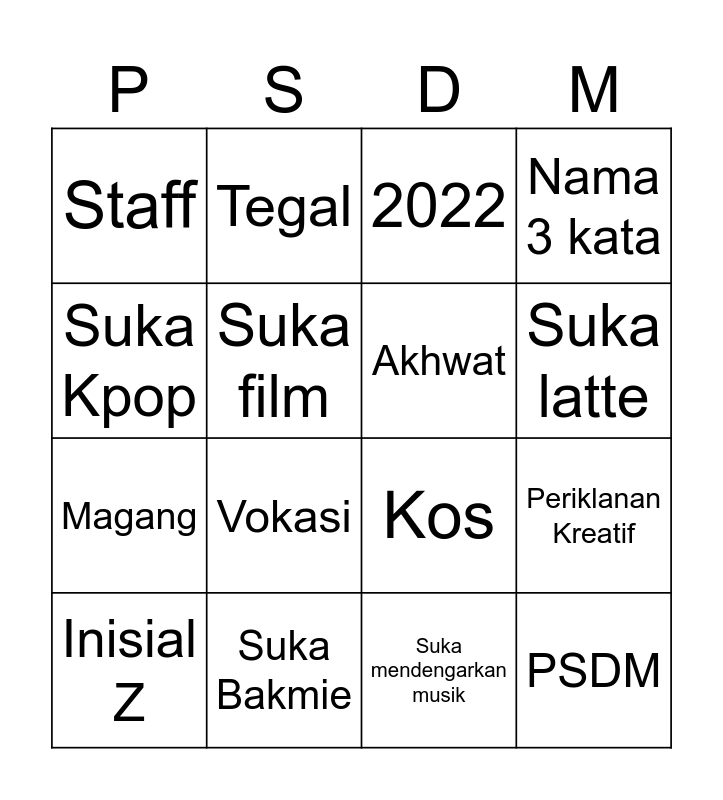 This bingo card has 16 words: Suka Bakmie, Periklanan Kreatif, 2022, Staff, Magang, Tegal, Kos, Suka mendengarkan musik, Suka Kpop, Suka film, Inisial Z, Nama 3 kata, Vokasi, Suka latte, Akhwat and PSDM.