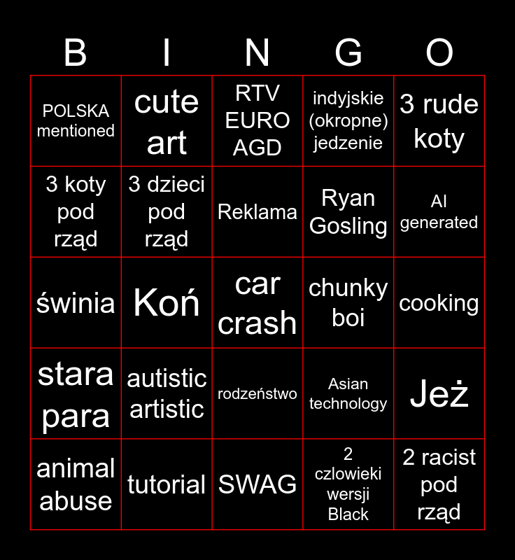 This bingo card has a free space and 24 words: autistic artistic, tutorial, Reklama, animal abuse, 3 rude koty, POLSKA mentioned, 3 koty pod rząd, cute art, chunky boi, rodzeństwo, Ryan Gosling, świnia, Asian technology, Jeż, 3 dzieci pod rząd, 2 czlowieki wersji Black, cooking, RTV EURO AGD, AI generated, Koń, 2 racist pod rząd, stara para, indyjskie (okropne) jedzenie and SWAG.