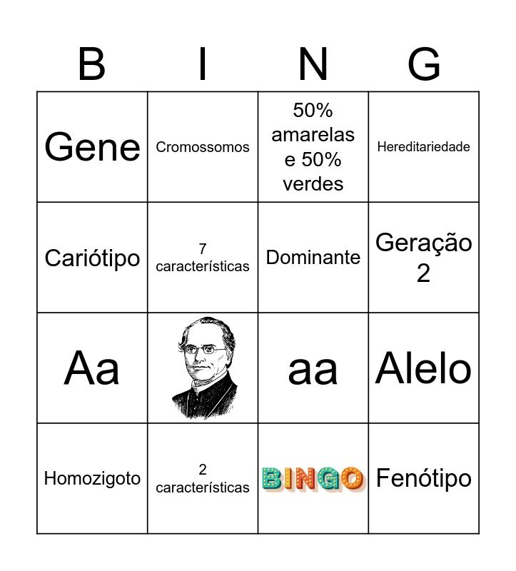 This bingo card has 2 images and 14 words: 2 características, Alelo, 50% amarelas e 50% verdes, Gene, Aa, Cromossomos, aa, Cariótipo, 7 características, Homozigoto, Hereditariedade, Geração 2, Dominante and Fenótipo.