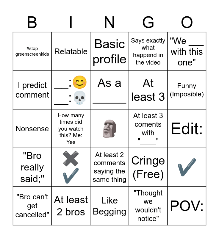 This bingo card has 25 words: ✖️ ✔️, Like Begging, As a _____, "Bro can't get cancelled", "We ___ with this one", #stop greenscreenkids, I predict comment, Relatable, At least 3 coments with "____", At least 2 comments saying the same thing, At least 3, Nonsense, Cringe (Free), ✔️, __:😊 __:💀, POV:, Edit:, Basic profile, Funny (Imposible), How many times did you watch this? Me: Yes, 🗿, At least 2 bros, "Bro really said;", Says exactly what happend in the video and "Thought we wouldn't notice".
