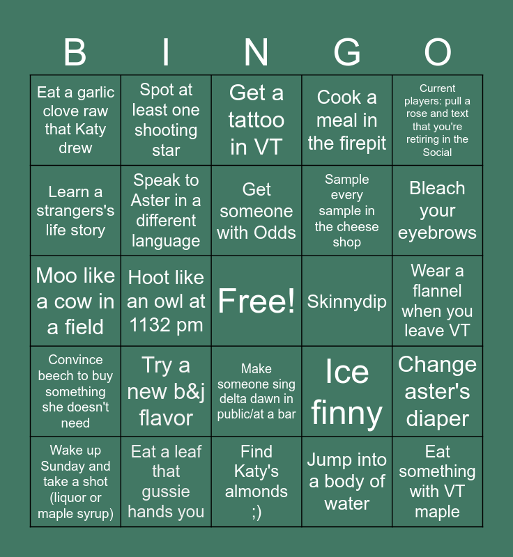 This bingo card has a free space and 24 words: Try a new b&j flavor, Eat a leaf that gussie hands you, Get someone with Odds, Wake up Sunday and take a shot (liquor or maple syrup), Current players: pull a rose and text that you're retiring in the Social, Eat a garlic clove raw that Katy drew, Learn a strangers's life story, Spot at least one shooting star, Skinnydip, Make someone sing delta dawn in public/at a bar, Sample every sample in the cheese shop, Moo like a cow in a field, Ice finny, Change aster's diaper, Speak to Aster in a different language, Jump into a body of water, Wear a flannel when you leave VT, Get a tattoo in VT, Bleach your eyebrows, Hoot like an owl at 1132 pm, Eat something with VT maple, Convince beech to buy something she doesn't need, Cook a meal in the firepit and Find Katy's almonds ;).