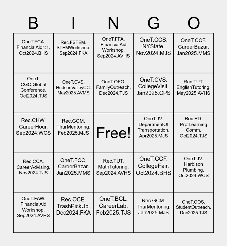 This bingo card has a free space and 26 words: Rec.TUT. MathTutoring. Sep2024.AVHS, Rec.GCM. ThurMentoring. Jan2025.MJS, OneT.OFO. FamilyOutreach. Dec2024.TJS, Rec.OCE. TrashPickUp. Dec2024.FKA, OneT.CCF. CareerBazar. Jan2025.MMS, OneT.FCA. FinancialAid1:1. Oct2024.BHS, OneT. CGC.Global Conference. Oct2024.TJS, Rec.FSTEM. STEMWorkshop. Sep2024.FKA, Rec.PD. ProfLearning Comm. Oct2024.TJS, OneT.CCF. CollegeFair. Oct2024.BHS, OneT.CVS. CollegeVisit. Jan2025.CPS, Rec.CHW. CareerHour. Sep2024.WCS, OneT.JV. Harbison Plumbing. Oct2024.WCS, OneT.FAW. FinancialAid Workshop. Sep2024.AVHS, Rec.GCM. ThurMentoring. Feb2025.MJS, Rec.CCR. AdvisorTraining. Mar2025.BHS, OneT.CCS. NYState. Nov2024.MJS, Rec.CCA. CareerAdvising. Nov2024.TJS, OneT.FFA. FinancialAid Workshop. Sep2024.AVHS, OneT.OOS. StudentOutreach. Dec2025.TJS, Rec.TUT. EnglishTutoring. May2025.AVHS, OneT.BCL. CareerLab. Feb2025.TJS, OneT.JV. DepartmentOf Transportation. Apr2025.MJS, OneT.FCC. CareerBazar. Jan2025.MMS, OneT.CVS. HudsonValleyCC. May2025.AVMS and Rec.PCM. PeerMentoring. Dec2024.BMS.