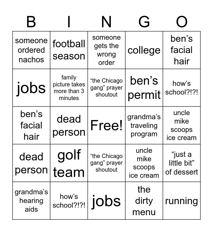 ⚠ This card has duplicate items: how’s school?!?! (7), running (2), marching band (2), the dirty menu (2), golf team (2), politics (2), football season (2), college (2), jobs (2), someone gets the wrong order (2), family picture takes more than 3 minutes (2), someone refers to us as the bamz (2), “just a little bit” of dessert (2), uncle mike scoops ice cream (2), grandma and aunt diane co-tell a story (2), grandma’s hearing aids (2), “the Chicago gang” prayer shoutout (2), grandma’s traveling program (2), the pink concert (2), ben’s facial hair (2), dead person (2), someone takes a pic of the kids table (2), ben’s permit (2), someone ordered nachos (2)
