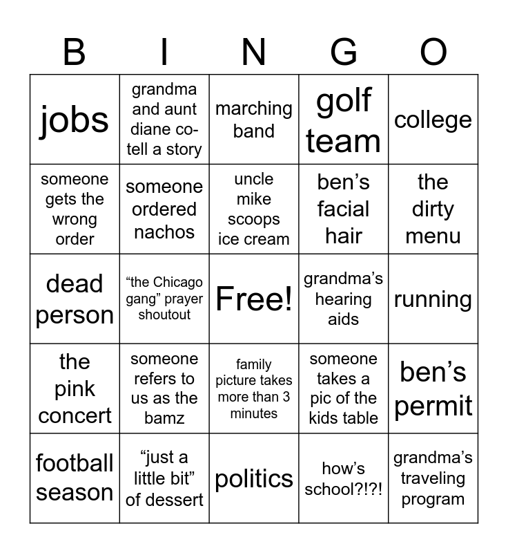 This bingo card has a free space and 24 words: someone refers to us as the bamz, “just a little bit” of dessert, uncle mike scoops ice cream, football season, college, jobs, someone gets the wrong order, grandma and aunt diane co-tell a story, grandma’s hearing aids, family picture takes more than 3 minutes, ben’s facial hair, dead person, someone takes a pic of the kids table, ben’s permit, someone ordered nachos, how’s school?!?!, running, marching band, the dirty menu, “the Chicago gang” prayer shoutout, grandma’s traveling program, the pink concert, golf team and politics.