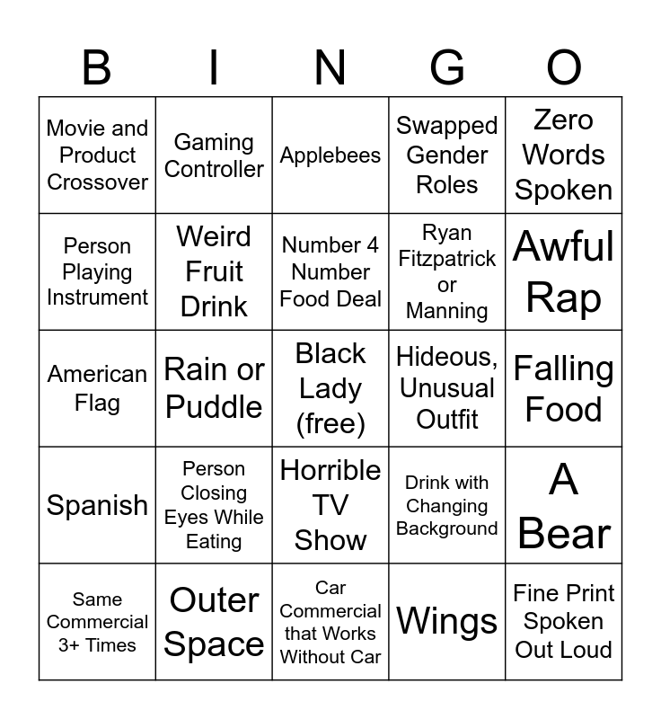 This bingo card has a free space and 55 words: Moderate to Severe, Same Commercial 3+ Times, Obscure R-Rated Trailer, Movie and Product Crossover, Car Commercial that Works Without Car, Beer Commercial with Truck, Weird Fruit Drink, NFL Player in Unfunny Commercial, Ryan Fitzpatrick or Manning, Guardians of the Galaxy Song, Swapped Gender Roles, 5G, Effeminate Man, AI, Screaming Child, Man and Dog, Zero Words Spoken, Rain or Puddle, School Bus, Fine Print Spoken Out Loud, Hideous, Unusual Outfit, Drag Queen, Drink with Changing Background, Applebees, Overweight Model, Number 4 Number Food Deal, Wings, Animated Commercial, Falling Food, A Bear, Talking Animal or Animal Mascot, Jewelry Commercial, Slo-mo or Time-Stop, Internal Monologue, Person Playing Instrument, American Flag, Classic Story with Product Placement, Spanish, Skydiver, Candy Commercial, Gaming Controller, Something Racist, Man in the Army, Treadmill, Person Closing Eyes While Eating, Outer Space, Person Talks to Narrator, Made in USA, Celebrity Cameo, Awful Rap, Country Song, Hospital Commercial, Person Talking to Camera, Horrible TV Show and Local Commerical.