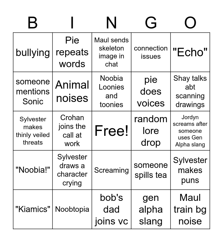 This bingo card has a free space and 24 words: Sylvester draws a character crying, Noobtopia, Noobia Loonies and toonies, "Kiamics", "Echo", bullying, someone mentions Sonic, Pie repeats words, random lore drop, Screaming, pie does voices, Sylvester makes thinly veiled threats, someone spills tea, Sylvester makes puns, Animal noises, gen alpha slang, Jordyn screams after someone uses Gen Alpha slang, Maul sends skeleton image in chat, Shay talks abt scanning drawings, Crohan joins the call at work, Maul train bg noise, "Noobia!", connection issues and bob's dad joins vc.