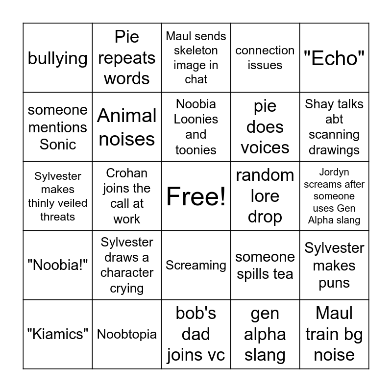 This bingo card has a free space and 24 words: Sylvester draws a character crying, Noobtopia, Noobia Loonies and toonies, "Kiamics", "Echo", bullying, someone mentions Sonic, Pie repeats words, random lore drop, Screaming, pie does voices, Sylvester makes thinly veiled threats, someone spills tea, Sylvester makes puns, Animal noises, gen alpha slang, Jordyn screams after someone uses Gen Alpha slang, Maul sends skeleton image in chat, Shay talks abt scanning drawings, Crohan joins the call at work, Maul train bg noise, "Noobia!", connection issues and bob's dad joins vc.