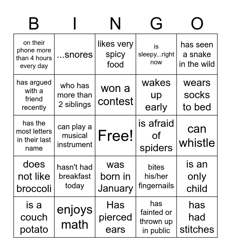 This bingo card has a free space and 24 words: hasn't had breakfast today, enjoys math, won a contest, is a couch potato, has seen a snake in the wild, on their phone more than 4 hours every day, has argued with a friend recently, ...snores, is afraid of spiders, was born in January, wakes up early, has the most letters in their last name, bites his/her fingernails, is an only child, who has more than 2 siblings, has fainted or thrown up in public, can whistle, likes very spicy food, wears socks to bed, can play a musical instrument, has had stitches, does not like broccoli, is sleepy...right now and Has pierced ears.