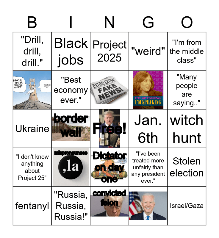 This bingo card has 8 images, a free space and 20 words: mispronounces, "Russia, Russia, Russia!", fentanyl, "I'm from the middle class", "Drill, drill, drill.", Black jobs, Jan. 6th, Dictator on day one, Ukraine, "I've been treated more unfairly than any president ever.", Stolen election, "Best economy ever.", witch hunt, Project 2025, "Many people are saying..", border wall, Israel/Gaza, "I don't know anything about Project 25", "weird" and convicted felon.