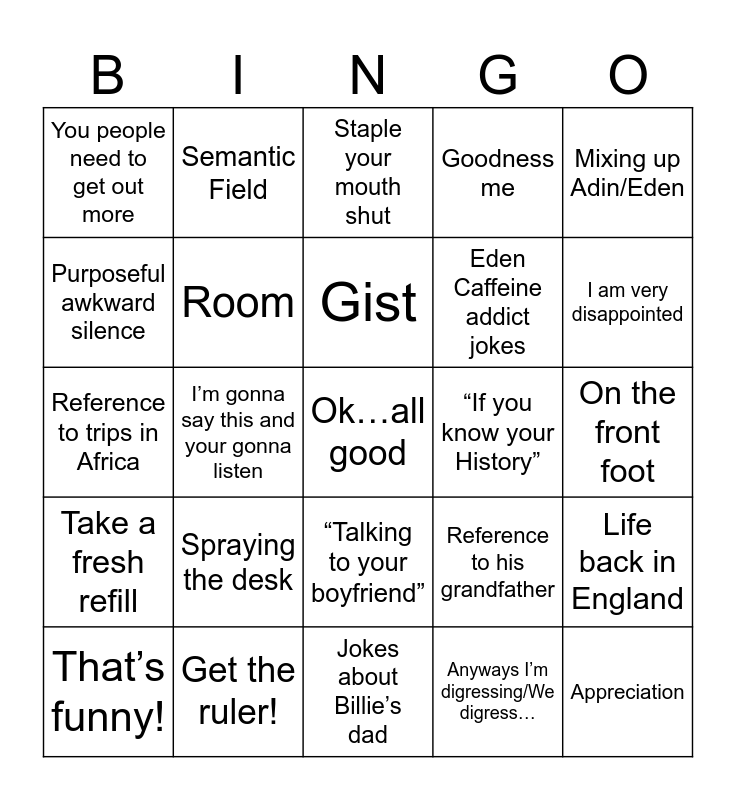 This bingo card has 25 words: Spraying the desk, Jokes about Billie’s dad, Gist, That’s funny!, Mixing up Adin/Eden, You people need to get out more, Purposeful awkward silence, Semantic Field, “If you know your History”, “Talking to your boyfriend”, Eden Caffeine addict jokes, Reference to trips in Africa, Reference to his grandfather, Life back in England, Room, Appreciation, On the front foot, Staple your mouth shut, I am very disappointed, I’m gonna say this and your gonna listen, Ok…all good, Get the ruler!, Take a fresh refill, Goodness me and Anyways I’m digressing/We digress….