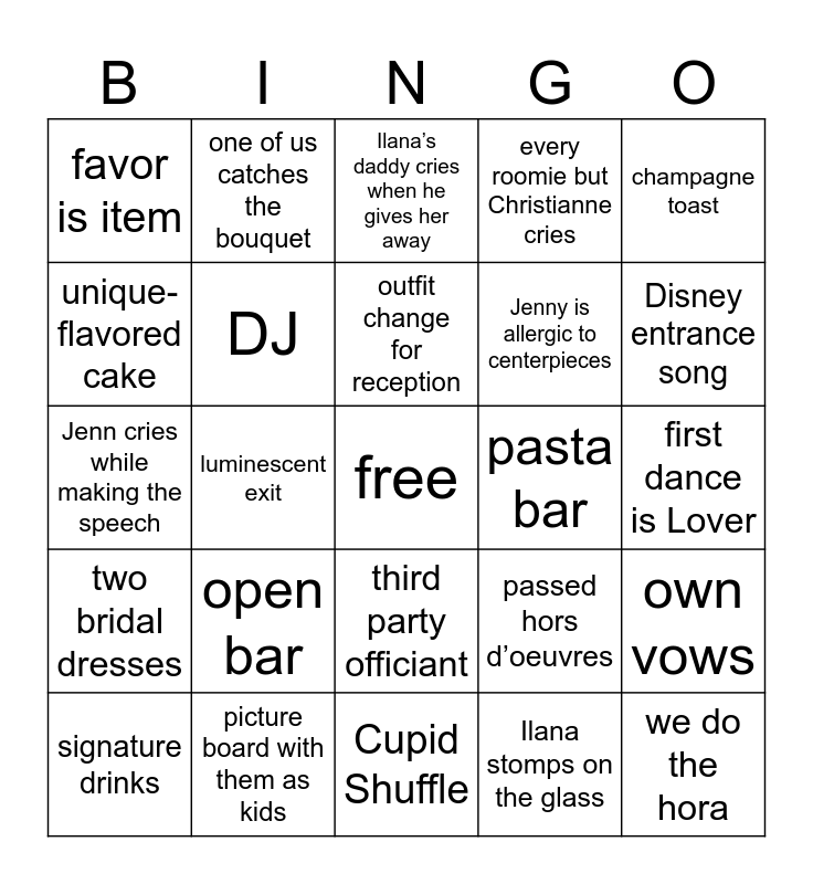 This bingo card has a free space and 24 words: open bar, picture board with them as kids, outfit change for reception, signature drinks, champagne toast, favor is item, unique-flavored cake, one of us catches the bouquet, pasta bar, third party officiant, Jenny is allergic to centerpieces, Jenn cries while making the speech, passed hors d’oeuvres, own vows, DJ, Ilana stomps on the glass, first dance is Lover, Ilana’s daddy cries when he gives her away, Disney entrance song, luminescent exit, we do the hora, two bridal dresses, every roomie but Christianne cries and Cupid Shuffle.
