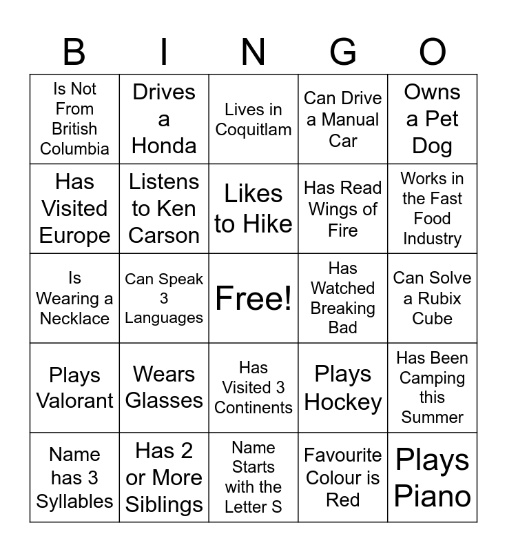 This bingo card has a free space and 24 words: Wears Glasses, Has 2 or More Siblings, Likes to Hike, Name has 3 Syllables, Owns a Pet Dog, Is Not From British Columbia, Has Visited Europe, Drives a Honda, Has Watched Breaking Bad, Has Visited 3 Continents, Has Read Wings of Fire, Is Wearing a Necklace, Plays Hockey, Has Been Camping this Summer, Listens to Ken Carson, Favourite Colour is Red, Can Solve a Rubix Cube, Lives in Coquitlam, Works in the Fast Food Industry, Can Speak 3 Languages, Plays Piano, Plays Valorant, Can Drive a Manual Car and Name Starts with the Letter S.