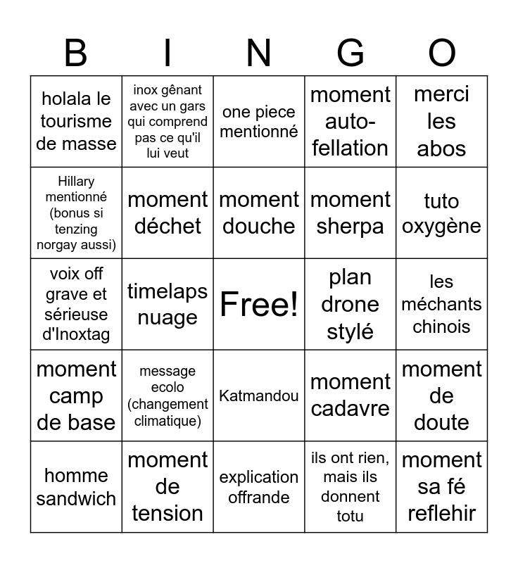 This bingo card has a free space and 24 words: message ecolo (changement climatique), moment de tension, moment douche, homme sandwich, merci les abos, holala le tourisme de masse, Hillary mentionné (bonus si tenzing norgay aussi), inox gênant avec un gars qui comprend pas ce qu'il lui veut, plan drone stylé, Katmandou, moment sherpa, voix off grave et sérieuse d'Inoxtag, moment cadavre, moment de doute, moment déchet, ils ont rien, mais ils donnent totu, les méchants chinois, one piece mentionné, tuto oxygène, timelaps nuage, moment sa fé reflehir, moment camp de base, moment auto-fellation and explication offrande.
