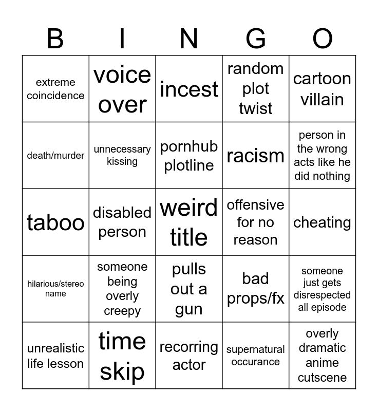 This bingo card has a free space and 24 words: someone being overly creepy, time skip, pornhub plotline, unrealistic life lesson, cartoon villain, extreme coincidence, death/murder, voice over, offensive for no reason, pulls out a gun, racism, taboo, bad props/fx, someone just gets disrespected all episode, unnecessary kissing, supernatural occurance, cheating, incest, person in the wrong acts like he did nothing, disabled person, overly dramatic anime cutscene, hilarious/stereo name, random plot twist and recorring actor.