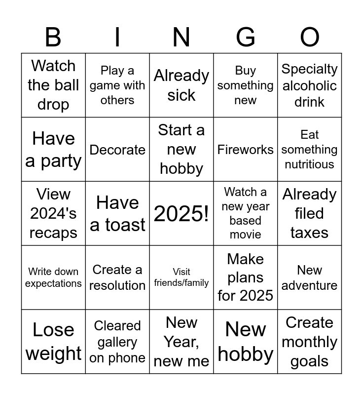 This bingo card has a free space and 24 words: Create a resolution, Cleared gallery on phone, Start a new hobby, Lose weight, Specialty alcoholic drink, Watch the ball drop, Have a party, Play a game with others, Watch a new year based movie, Visit friends/family, Fireworks, View 2024's recaps, Make plans for 2025, New adventure, Decorate, New hobby, Already filed taxes, Already sick, Eat something nutritious, Have a toast, Create monthly goals, Write down expectations, Buy something new and New Year, new me.