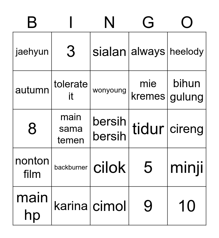 This bingo card has 25 words: backburner, cimol, wonyoung, main hp, heelody, jaehyun, autumn, 3, tidur, cilok, mie kremes, 8, 5, minji, tolerate it, 10, cireng, sialan, bihun gulung, main sama temen, bersih bersih, karina, nonton film, always and 9.