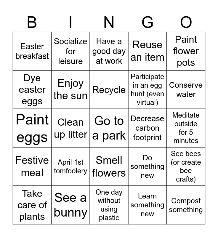 This bingo card has a free space and 24 words: April 1st tomfoolery, See a bunny, Recycle, Take care of plants, Paint flower pots, Easter breakfast, Dye easter eggs, Socialize for leisure, Decrease carbon footprint, Smell flowers, Participate in an egg hunt (even virtual), Paint eggs, Do something new, See bees (or create bee crafts), Enjoy the sun, Learn something new, Meditate outside for 5 minutes, Have a good day at work, Conserve water, Clean up litter, Compost something, Festive meal, Reuse an item and One day without using plastic.