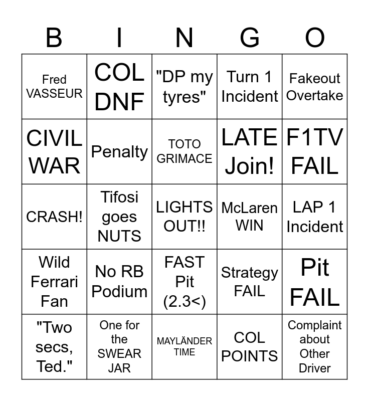 This bingo card has a free space and 24 words: No RB Podium, One for the SWEAR JAR, TOTO GRIMACE, "Two secs, Ted.", Fakeout Overtake, Fred VASSEUR, CIVIL WAR, COL DNF, McLaren WIN, FAST Pit (2.3<), LATE Join!, CRASH!, Strategy FAIL, Pit FAIL, Penalty, COL POINTS, LAP 1 Incident, "DP my tyres", F1TV FAIL, Tifosi goes NUTS, Complaint about Other Driver, Wild Ferrari Fan, Turn 1 Incident and MAYLÄNDER TIME.