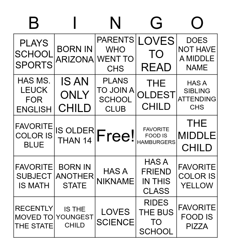 This bingo card has a free space and 24 words: BORN IN ANOTHER STATE, IS THE YOUNGEST CHILD, PLANS TO JOIN A SCHOOL CLUB, RECENTLY MOVED TO THE STATE, DOES NOT HAVE A MIDDLE NAME, PLAYS SCHOOL SPORTS, HAS MS. LEUCK FOR ENGLISH, BORN IN ARIZONA, FAVORITE FOOD IS HAMBURGERS, HAS A NIKNAME, THE OLDEST CHILD, FAVORITE COLOR IS BLUE, HAS A FRIEND IN THIS CLASS, FAVORITE COLOR IS YELLOW, IS AN ONLY CHILD, RIDES THE BUS TO SCHOOL, THE MIDDLE CHILD, PARENTS WHO WENT TO CHS, HAS A SIBLING ATTENDING CHS, IS OLDER THAN 14, FAVORITE FOOD IS PIZZA, FAVORITE SUBJECT IS MATH, LOVES TO READ and LOVES SCIENCE.