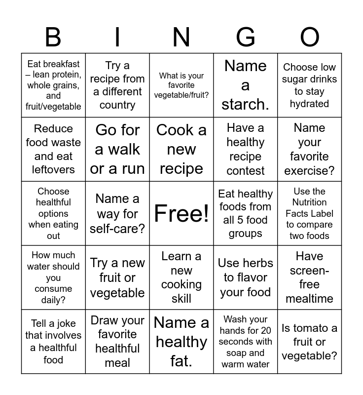 This bingo card has a free space and 24 words: Try a new fruit or vegetable, Draw your favorite healthful meal, Cook a new recipe, Tell a joke that involves a healthful food, Choose low sugar drinks to stay hydrated, Eat breakfast – lean protein, whole grains, and fruit/vegetable, Reduce food waste and eat leftovers, Try a recipe from a different country, Eat healthy foods from all 5 food groups, Learn a new cooking skill, Have a healthy recipe contest, Choose healthful options when eating out, Use herbs to flavor your food, Have screen-free mealtime, Go for a walk or a run, Wash your hands for 20 seconds with soap and warm water, Use the Nutrition Facts Label to compare two foods, What is your favorite vegetable/fruit?, Name your favorite exercise?, Name a way for self-care?, Is tomato a fruit or vegetable?, How much water should you consume daily?, Name a starch. and Name a healthy fat..