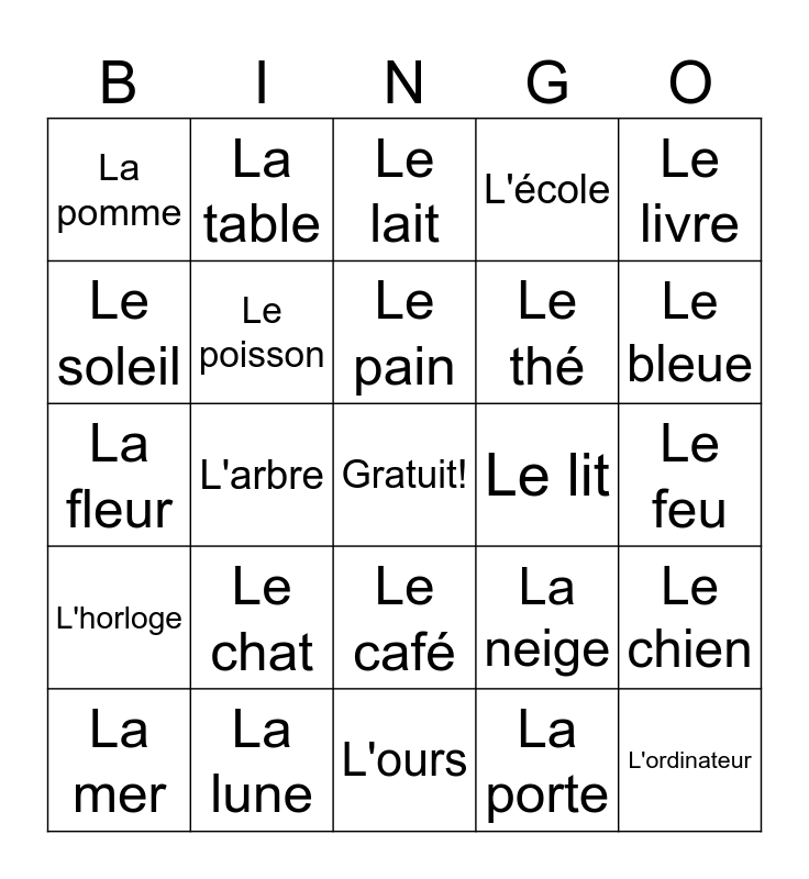 This bingo card has a free space and 24 words: Le chat, La lune, Le pain, La mer, Le livre, La pomme, Le soleil, La table, Le lit, Le café, Le thé, La fleur, La neige, Le chien, Le poisson, La porte, Le feu, Le lait, Le bleue, L'arbre, L'ordinateur, L'horloge, L'école and L'ours.