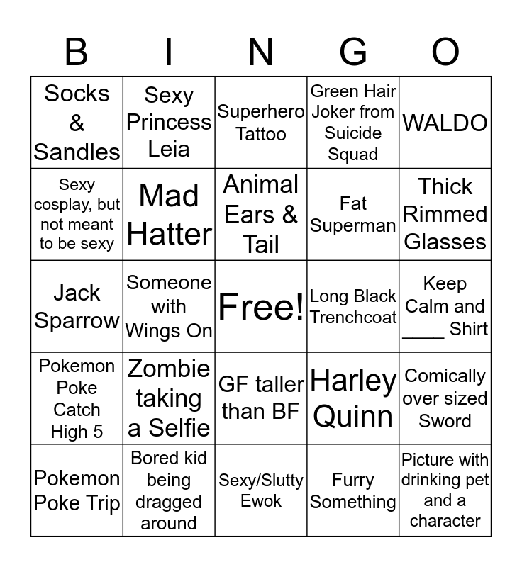 This bingo card has a free space and 24 words: Zombie taking a Selfie, Bored kid being dragged around, Animal Ears & Tail, Pokemon Poke Trip, WALDO, Socks & Sandles, Sexy cosplay, but not meant to be sexy, Sexy Princess Leia, Long Black Trenchcoat, GF taller than BF, Fat Superman, Jack Sparrow, Harley Quinn, Comically over sized Sword, Mad Hatter, Furry Something, Keep Calm and ____ Shirt, Superhero Tattoo, Thick Rimmed Glasses, Someone with Wings On, Picture with drinking pet and a character, Pokemon Poke Catch High 5, Green Hair Joker from Suicide Squad and Sexy/Slutty Ewok.