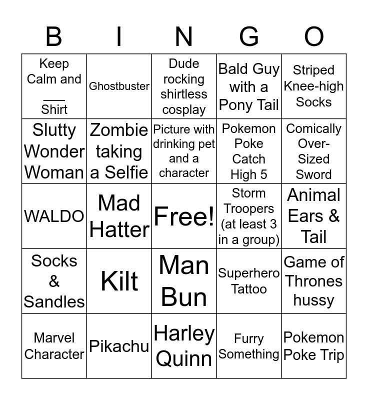 This bingo card has a free space and 24 words: Kilt, Pikachu, Picture with drinking pet and a character, Marvel Character, Striped Knee-high Socks, Keep Calm and ___ Shirt, Slutty Wonder Woman, Ghostbuster, Storm Troopers (at least 3 in a group), Man Bun, Pokemon Poke Catch High 5, WALDO, Superhero Tattoo, Game of Thrones hussy, Zombie taking a Selfie, Furry Something, Animal Ears & Tail, Dude rocking shirtless cosplay, Comically Over-Sized Sword, Mad Hatter, Pokemon Poke Trip, Socks & Sandles, Bald Guy with a Pony Tail and Harley Quinn.