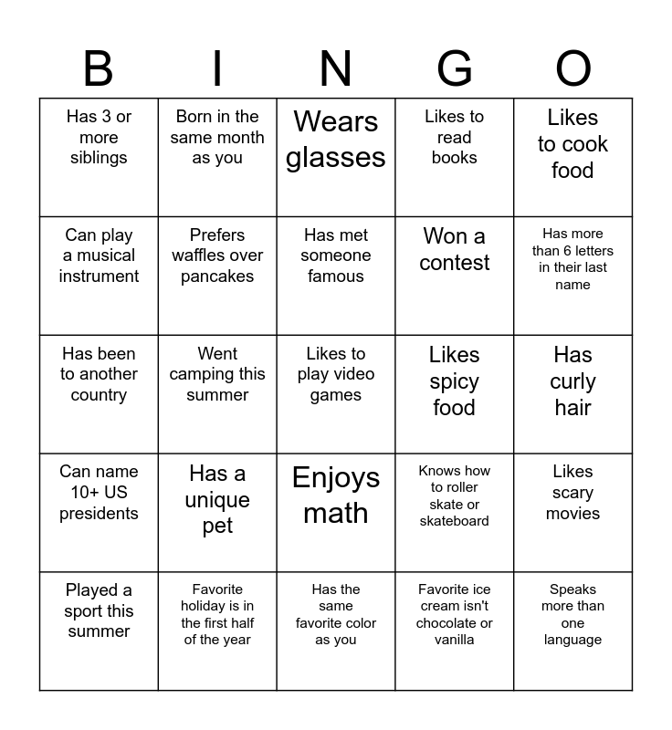 This bingo card has 25 words: Has a unique pet, Has the same favorite color as you, Has met someone famous, Played a sport this summer, Likes to cook food, Has 3 or more siblings, Can play a musical instrument, Born in the same month as you, Likes spicy food, Enjoys math, Won a contest, Has been to another country, Knows how to roller skate or skateboard, Likes scary movies, Prefers waffles over pancakes, Speaks more than one language, Has curly hair, Wears glasses, Has more than 6 letters in their last name, Went camping this summer, Likes to play video games, Favorite holiday is in the first half of the year, Can name 10+ US presidents, Likes to read books and Favorite ice cream isn't chocolate or vanilla.