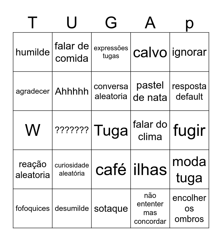 This bingo card has a free space and 24 words: fofoquices, curiosidade aleatória, conversa aleatoria, não ententer mas concordar, ignorar, humilde, falar de comida, expressões tugas, falar do clima, fugir, W, Ahhhhh, ilhas, moda tuga, agradecer, desumilde, sotaque, calvo, resposta default, reação aleatoria, ???????, café, pastel de nata and encolher os ombros.
