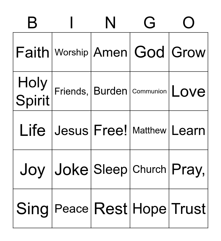 This bingo card has a free space and 25 words: Joke, Rest, Burden, Sing, Grow, Faith, Holy Spirit, Worship, Matthew, Sleep, Communion, Life, Church, Pray,, Friends,, Bible, Learn, Amen, Love, Jesus, Trust, Peace, Joy, God and Hope.