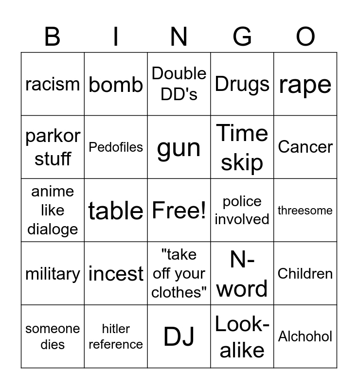 This bingo card has a free space and 24 words: incest, hitler reference, gun, someone dies, rape, racism, parkor stuff, bomb, police involved, "take off your clothes", Time skip, anime like dialoge, N-word, Children, Pedofiles, Look-alike, threesome, Double DD's, Cancer, table, Alchohol, military, Drugs and DJ.