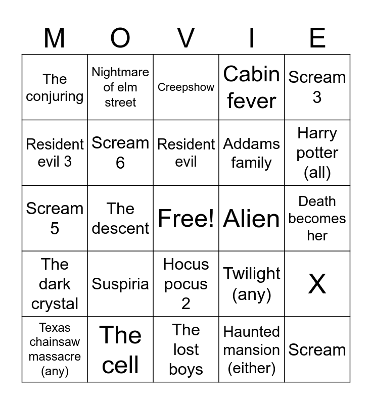 This bingo card has a free space and 77 words: Halloween Moive Bingo List, Trick r treat, Creepshow, Creepshow 2, Halloween (original), Devil’s rejects, Friday the 13th (any), House of a thousand corpses, Death proof, Planet terror, Dawn of the dead (remake), Land of the dead, Resident evil, Resident evil 3, Train to busan, The descent, Get out, Scream, Scream 2, Scream 3, Scream 4, Scream 5, Scream 6, Nightmare of elm street, Cabin fever, Cabin in the woods, Return of the living dead, Return of the living dead 3, Jeepers creepers, Jeepers creepers (new), Abigail, Interview with the vampire, Blade, Twilight (any), Harry potter (all), Addams family, The munsters, Clue, Death becomes her, Haunted mansion (either), Devils advocate, Rocky horror picture show, Nightmare before christmas, Casper, Fear street (all), The hills have eyes, Texas chainsaw massacre (any), The conjuring, Final destination, A quiet place, Hocus pocus, Hocus pocus 2, It, Zombieland, Practical magic, Shaun of the dead, Young frankenstein, Psycho, Midsommar, Dont breathe, Suspiria, Jennifers body, The craft, The blair witch project, Amityville horror, Hellraiser, Slither, Alien, Sixth sense, Scary movie, Pearl, X, The dark crystal, The cell, Donnie darko, The lost boys and The invisible man.