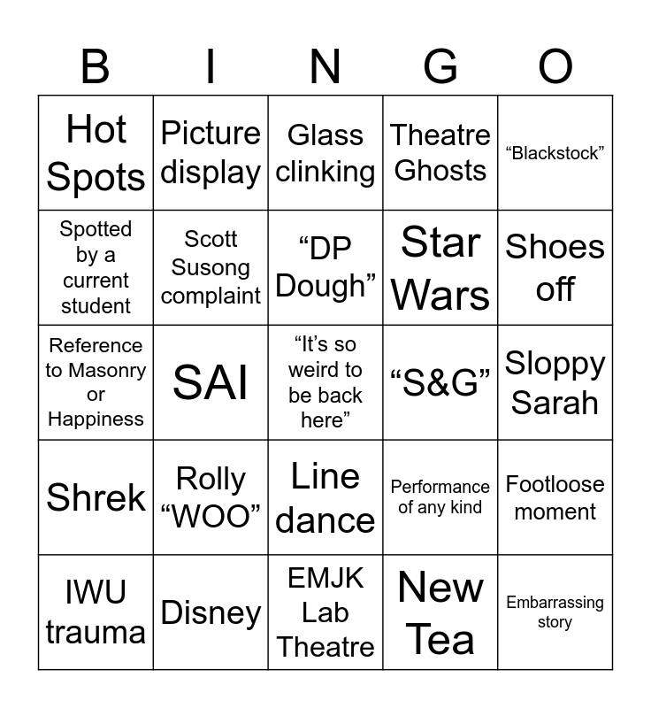 This bingo card has a free space and 35 words: Change is pointed out, Can’t remember a reference, Someone cries, Scott Susong complaint, Line dance, Theatre Ghosts, Spotted by a current student, Nerdy vows, “DP Dough”, “Post Mortem”, Reference to Masonry or Happiness, “Blackstock”, “Wing Wednesday”, TGOE, Hot Spots, “S&G”, New Tea, SAI, Shrek, Embarrassing story, Performance of any kind, IWU trauma, Footloose moment, Disney, Glass clinking, Shoes off, Dress transformation / change, Harry Potter, Star Wars, Sloppy Sarah, SoTA Show reference, EMJK Lab Theatre, Rolly “WOO”, Picture display and Classmate reference.