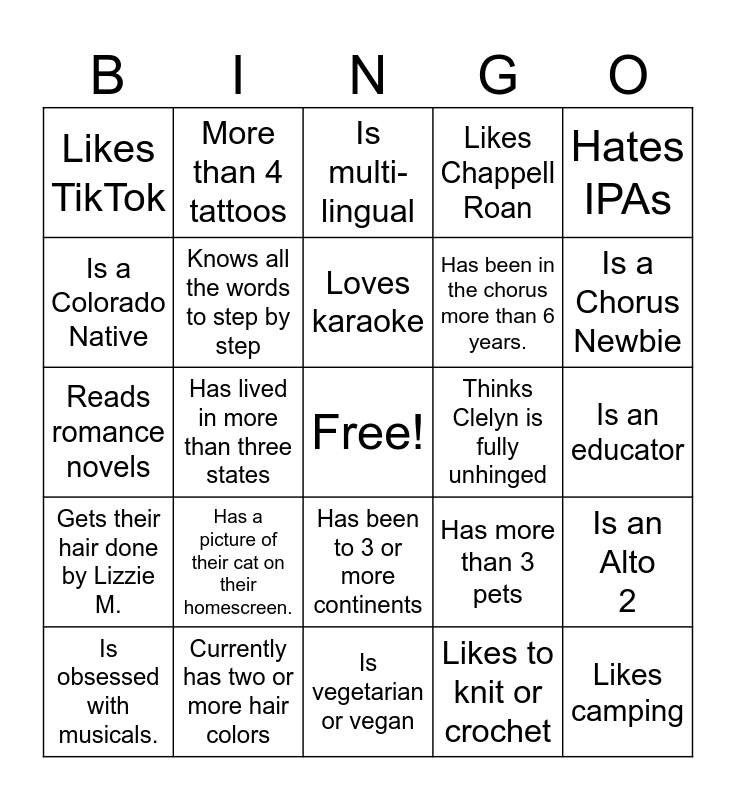 This bingo card has a free space and 27 words: Has more than 3 pets, No tattoos, Has been in the chorus more than 6 years., Is vegetarian or vegan, Is a Colorado Native, Is multi-lingual, More than 4 tattoos, Gets their hair done by Lizzie M., Thinks Clelyn is fully unhinged, Is an Alto 2, Reads romance novels, Likes Chappell Roan, Is obsessed with musicals., Currently has two or more hair colors, Is a Chorus Newbie, Has run a 5k, Knows all the words to step by step, Loves karaoke, Has a picture of their cat on their homescreen., Likes TikTok, Is an educator, Likes to knit or crochet, Has lived in more than three states, Likes camping, Has been to 3 or more continents, Hates IPAs and Loves to cook.