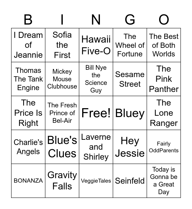 This bingo card has a free space and 52 words: SpongeBob SquarePants, Today is Gonna be a Great Day, My Little Pony, VeggieTales, Blue's Clues, Dora The Explorer, Sofia the First, What's New Scooby-Doo?, Thomas The Tank Engine, PAW Patrol, Mickey Mouse Clubhouse, Shake It Up, Fairly OddParents, Hey Jessie, The Magic School Bus, Hot Potato, Bill Nye the Science Guy, Bluey, The Muppet Show, The Best of Both Worlds, The Fresh Prince of Bel-Air, Seinfeld, I Dream of Jeannie, Sesame Street, Barney and Friends, Won't You Be My Neighbor?, The Andy Griffith, From The Brady Bunch, The Pink Panther, The Office, Jeopardy, The Wheel of Fortune, Family Feud, The Twilight Zone, The Addams Family, Hawaii Five-O, Gravity Falls, Peppa Pig, Curious George, I'll Be There for You, Stranger Things, The Lone Ranger, Charlie's Angels, Downton Abbey, Laverne and Shirley, The Monkees, Come On Get Happy, The Price Is Right, S.W.A.T., Law & Order, BONANZA and Love And Marriage.