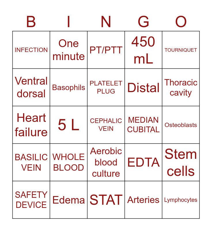 This bingo card has a free space and 34 words: 25 gauge, Osteoclast, 21 GAUGE NEEDLE, SODIUM CITRATE, Osteoblasts, Ventral dorsal, Basophils, STAT, Distal, Lymphocytes, Heart failure, One minute, Arteries, ORDER OF DRAW, BASILIC VEIN, 5 L, Aerobic blood culture, MEDIAN CUBITAL, Stem cells, SAFETY DEVICE, Edema, Anaerobic blood culture, 450 mL, Thoracic cavity, SERUM, WHOLE BLOOD, PT/PTT, HEMOTOMA, TOURNIQUET, INFECTION, 2X2 GAUZE, PLATELET PLUG, EDTA and PALPATE.