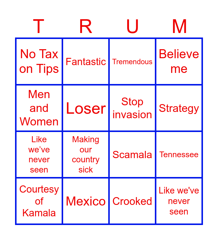 ⚠ This card has duplicate items: Money (2), No Tax on Tips (2), Loser (2), Making our country sick (2), Trump (2), Men and Women (2), Tennessee (2), Believe me (2), Courtesy of Kamala (2), Crooked (2), Mexico (2)