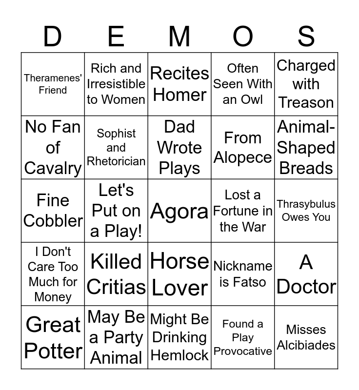 This bingo card has a free space and 24 words: Killed Critias, May Be a Party Animal, Dad Wrote Plays, Great Potter, Charged with Treason, Theramenes' Friend, No Fan of Cavalry, Rich and Irresistible to Women, Lost a Fortune in the War, Horse Lover, From Alopece, Fine Cobbler, Nickname is Fatso, A Doctor, Sophist and Rhetorician, Found a Play Provocative, Thrasybulus Owes You, Recites Homer, Animal-Shaped Breads, Let's Put on a Play!, Misses Alcibiades, I Don't Care Too Much for Money, Often Seen With an Owl and Might Be Drinking Hemlock.