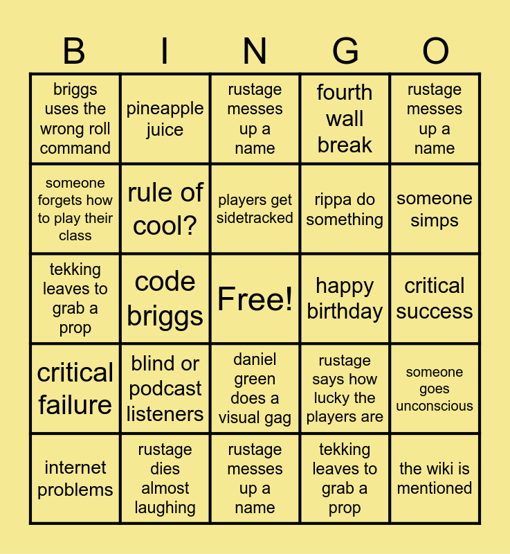 ⚠ This card has duplicate items: someone simps (2), the wiki is mentioned (2), internet problems (2), rustage messes up a name (3), blind or podcast listeners (2), someone forgets something from the last episode (2), pineapple juice (2), reference to a different campaign (2), someone forgets how to play their class (2), rustage dies almost laughing (2), rule of cool? (2), fourth wall break (2), someone goes unconscious (2), rustage says how lucky the players are (2), critical success (2), critical failure (2), players get sidetracked (2), happy birthday (2), someone takes a bathroom break (2), code briggs (2), tekking leaves to grab a prop (2), briggs uses the wrong roll command (2), rippa do something (2), daniel green does a visual gag (2), shwabadi is the voice of reason (2)