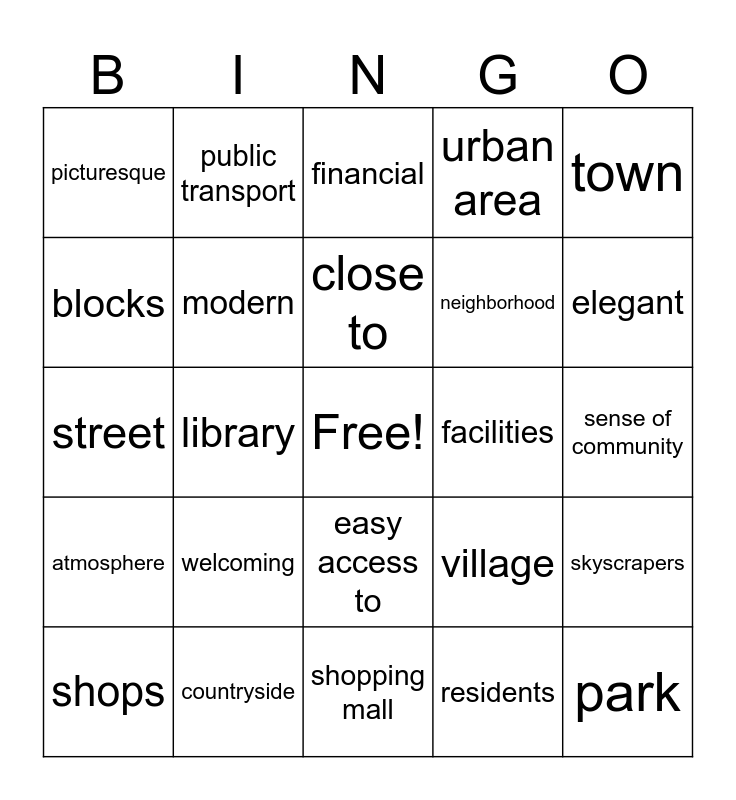This bingo card has a free space and 28 words: skyscrapers, built-up, neighborhood, residents, blocks, financial, public transport, atmosphere, facilities, shops, street, urban area, countryside, shopping mall, elegant, unfriendly, welcoming, modern, close to, easy access to, picturesque, city-center, park, library, sense of community, village, town and city.