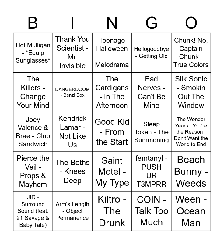 This bingo card has a free space and 40 words: The Cardigans - Lovefool, Joey Valence & Brae - Club Sandwich, Hot Mulligan - End Eric Sparrow and the Rest of Him, DANGERDOOM - Benzi Box, Arm's Length - Object Permanence, Saint Motel - My Type, The Cardigans - In The Afternoon, Bayside - Good Advice, Chunk! No, Captain Chunk - True Colors, Pierce the Veil - Props & Mayhem, Kendrick Lamar - Not Like Us, Hellogoodbye - Getting Old, Ween - Ocean Man, The Wonder Years - You're the Reason I Don't Want the World to End, Sleep Token - The Summoning, The Beths - Knees Deep, Joey Valence & Brae - Punk Tactics, Hot Mulligan - *Equip Sunglasses*, Ben Quad - Blood for the Blood God, Teenage Halloween - Melodrama, Beach Bunny - Weeds, COIN - Talk Too Much, Bad Nerves - Can't Be Mine, The Killers - Change Your Mind, Joey Valence & Brae - DOUGHBOY (feat. Terror Reid), Hot Mulligan - Gans Media Retro Games, Nightmare of You - I Want to Be Buried in Your Backyard, Pet Symmetry - Please Don't Tell My Father That I Used His 1996 Honda Accord to Destroy the Town of Willow Grove, Pennsylvania in 2002, Death Cab for Cutie - Little Bribes, Glorb - The Bottom 2, Denzel Curry - Troubles [Feat. T-Pain], JID - Surround Sound (feat. 21 Savage & Baby Tate), De La Soul - Rock Co.Kane Flow (feat. MF DOOM), femtanyl - PUSH UR T3MPRR, Silk Sonic - Smokin Out The Window, Kiltro - The Drunk, Anderson .Paak - Come Down, CAKE - Love You Madly, Thank You Scientist - Mr. Invisible and Against Me! - Stop!.
