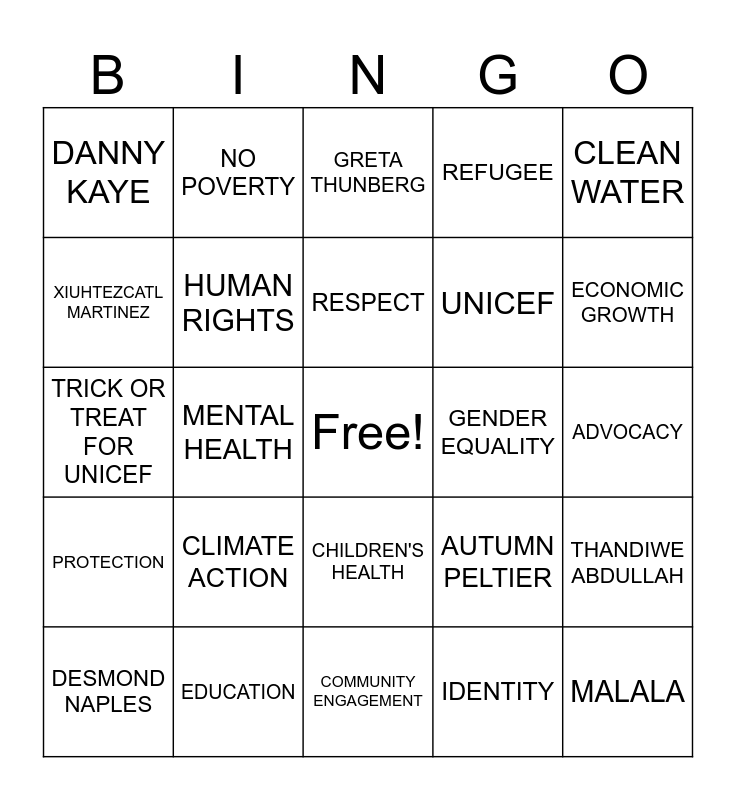 This bingo card has a free space and 41 words: FREE, TRICK OR TREAT FOR UNICEF, WORLD CHILDREN'S DAY, HUMAN RIGHTS, EDUCATION, CHILDREN'S HEALTH, RESPECT, SUSTAINABILITY, CLEAN WATER, PROTECTION, MENTAL HEALTH, REFUGEE, MALALA, ADVOCACY, GENDER EQUALITY, CLIMATE ACTION, JUSTICE, DANNY KAYE, CATHERINE RUSSELL, GRETA THUNBERG, THANDIWE ABDULLAH, BANA ALABED, COMMUNITY ENGAGEMENT, UNICEF, DEC. 11TH, FREEDOM, IDENTITY, RIGHT TO RECOVERY, ECONOMIC GROWTH, RESPONSIBLE CONSUMPTION, LIFE ON LAND, NO POVERTY, DESMOND NAPLES, NAOMI WADLER, AUTUMN PELTIER, XIUHTEZCATL MARTINEZ, PROTECTION OF PRIVACY, RECOVERY, REINTEGRATION, FREEDOM OF THOUGHT and KEEPING FAMILIES TOGETHER.