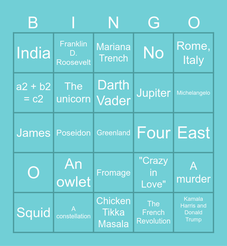 This bingo card has 25 words: An owlet, Chicken Tikka Masala, Darth Vader, Squid, Rome, Italy, India, a2 + b2 = c2, Franklin D. Roosevelt, Four, Fromage, Jupiter, James, "Crazy in Love", A murder, The unicorn, Kamala Harris and Donald Trump, East, Mariana Trench, Michelangelo, Poseidon, Greenland, A constellation, O, No and The French Revolution.