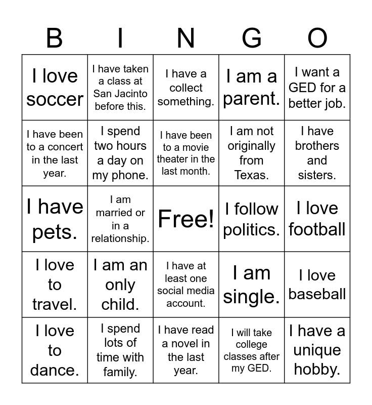 This bingo card has a free space and 24 words: I am an only child., I spend lots of time with family., I have been to a movie theater in the last month., I love to dance., I want a GED for a better job., I love soccer, I have been to a concert in the last year., I have taken a class at San Jacinto before this., I follow politics., I have at least one social media account., I am not originally from Texas., I have pets., I am single., I love baseball, I spend two hours a day on my phone., I will take college classes after my GED., I love football, I have a collect something., I have brothers and sisters., I am married or in a relationship., I have a unique hobby., I love to travel., I am a parent. and I have read a novel in the last year..