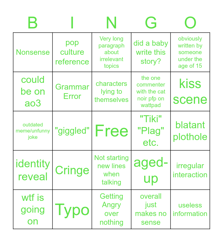 This bingo card has a free space and 30 words: Typo, Crying, "giggled", unnecessarily detailed description of scent, Nonsense, Very long paragraph about irrelevant topics, Grammar Error, Not starting new lines when talking, "Tiki" "Plag" etc., Getting Angry over nothing, blatant plothole, useless information, overall just makes no sense, unintentionally funny, kiss scene, suicide or self harm, aged-up, identity reveal, Cringe, obviously written by someone under the age of 15, outdated meme/unfunny joke, makes me want to fall asleep, pop culture reference, the one commenter with the cat noir pfp on wattpad, could be on ao3, did a baby write this story?, irregular interaction, wtf is going on, characters lying to themselves and im actually interested.