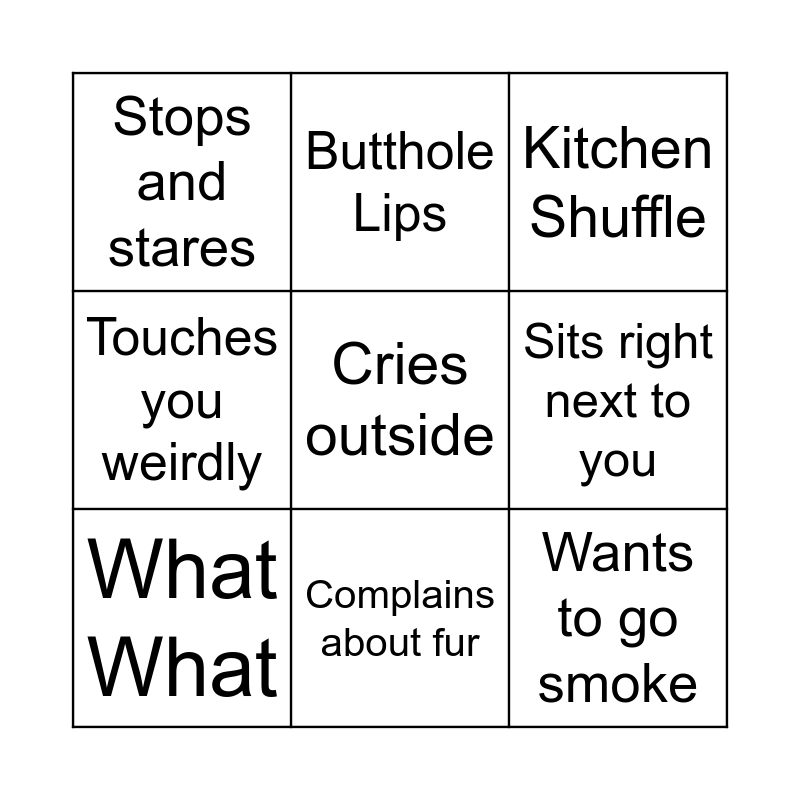 This bingo card has 9 words: What What, Kitchen Shuffle, Butthole Lips, Touches you weirdly, Stops and stares, Sits right next to you, Cries outside, Wants to go smoke and Complains about fur.