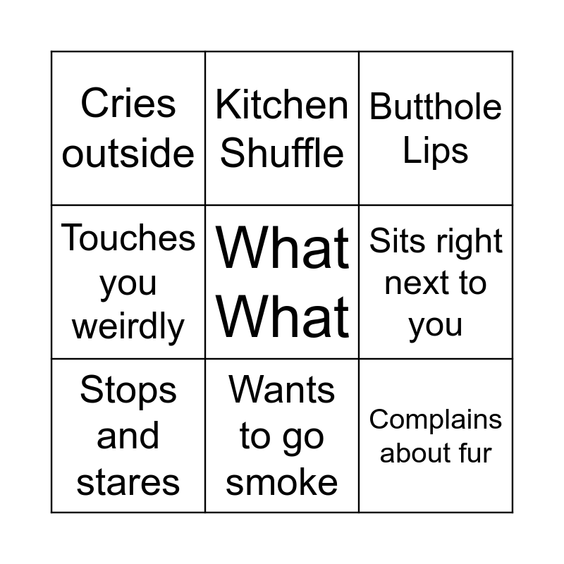 This bingo card has 9 words: Stops and stares, Butthole Lips, Kitchen Shuffle, Touches you weirdly, Cries outside, Sits right next to you, What What, Complains about fur and Wants to go smoke.